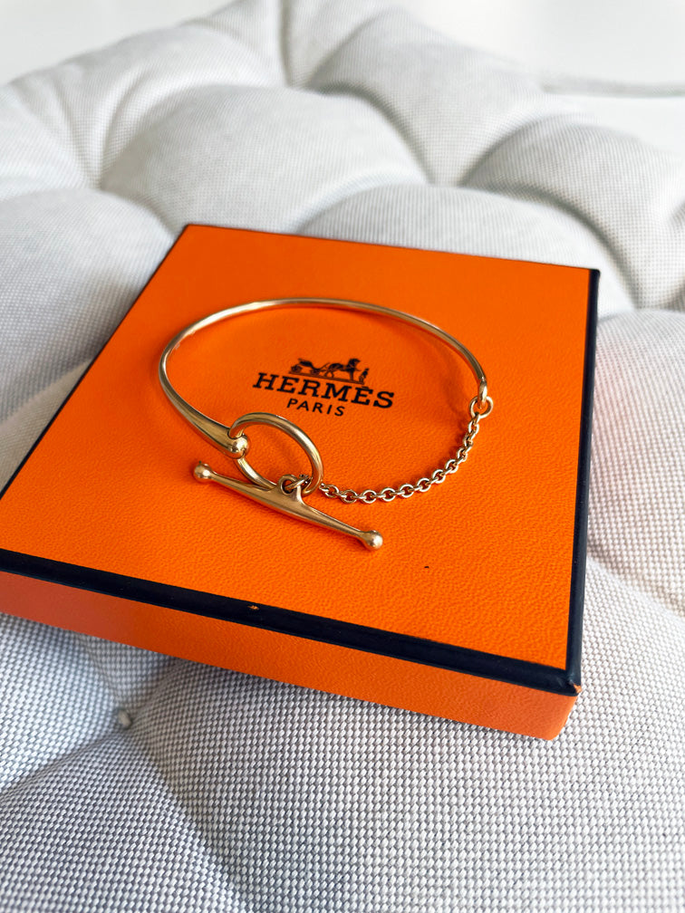 A rare 18k Rose Gold Filet d'Or Bracelet by Hermes®, featuring a simple toggle closure and a hinge at the centre. An elegant, simple and classic bracelet. The bracelet is clean and flawless with no visible signs of wear.