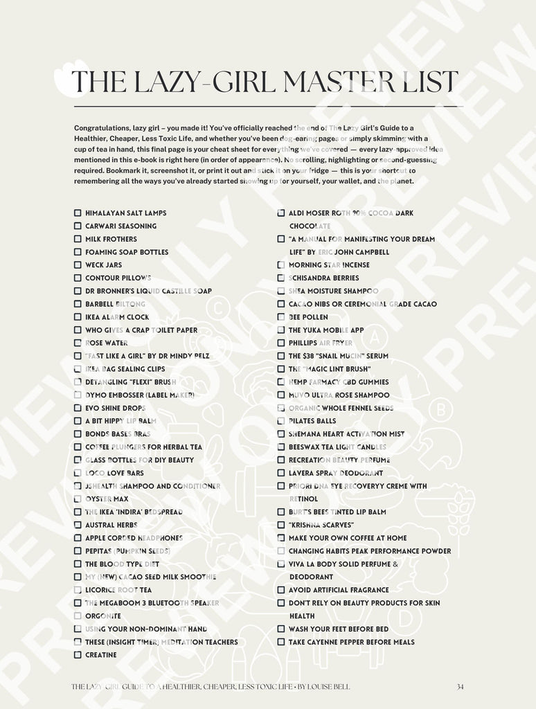 • Two Lazy-Girl Master Lists (one by order of appearance, one by category): Every single thing mentioned in this e-book, all on one handy page! Bookmark it, screenshot it, or stick it on the fridge — it’s your cheat sheet for remembering all the little (but powerful) ways you’re already showing up for yourself, your bank account, and the planet.