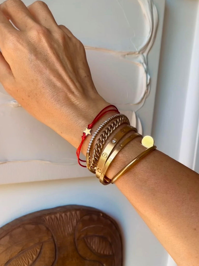 This delicate red cord bracelet features a polished gold star charm that slides gently along the centre — a little reminder to stay guided, grounded and connected to your own inner light.
