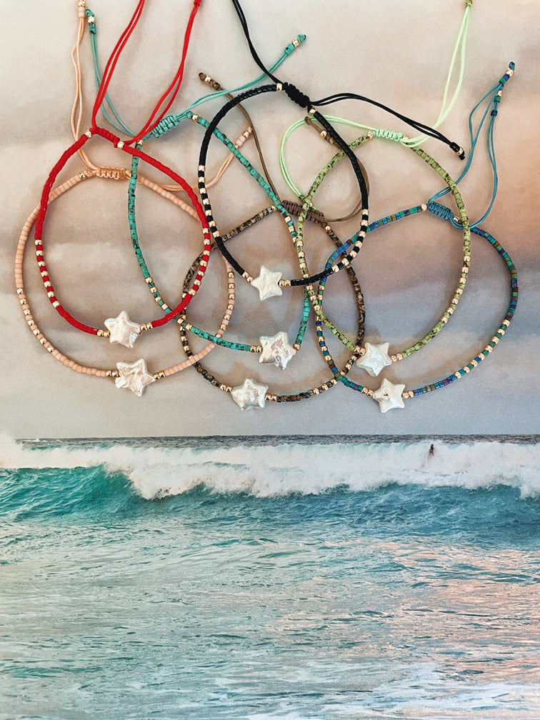 A simple yet chic accessory, this delicate bracelet features a stunning pearl star in the centre and shiny gold beads scattered in amongst dainty Japanese glass beads. It has an adjustable closure.