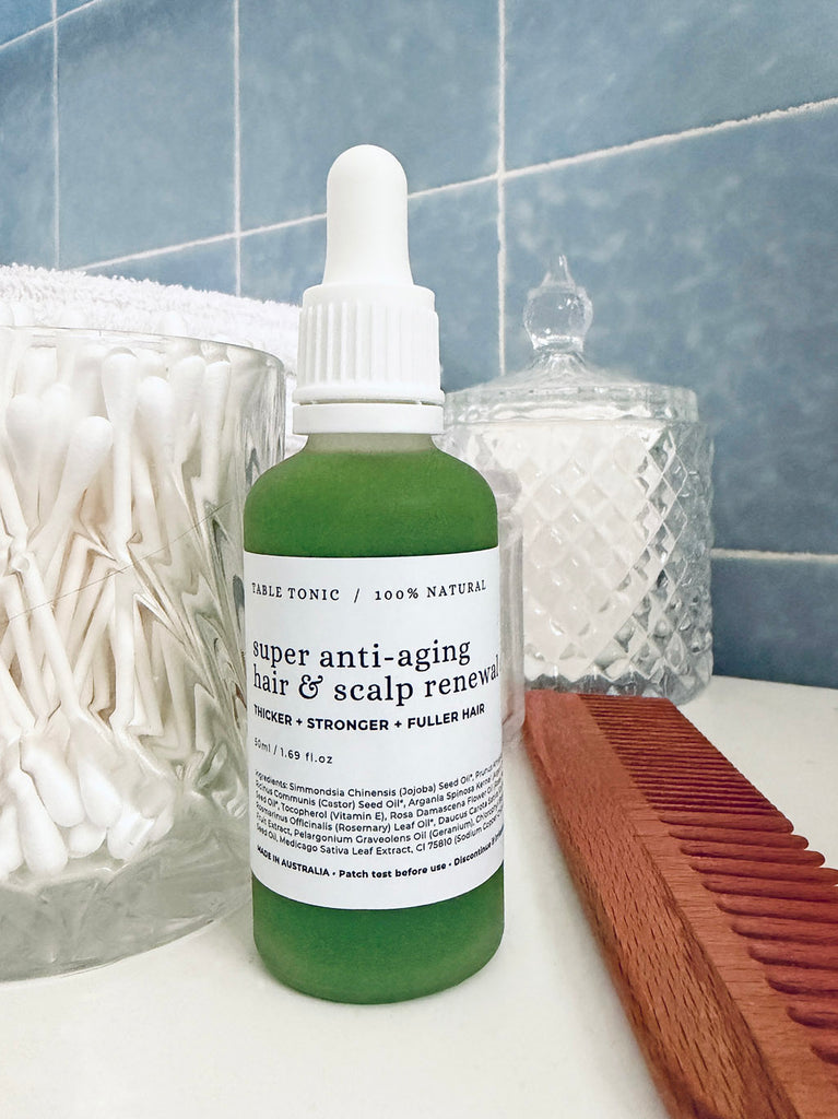 One day your hair just feels… different. Less dense at the crown. Softer at the temples. A little more shedding in the shower. Aging slowly shifts more than just our moods and cycles — it shifts circulation, oil production, and the growth phase of your hair. Super Anti-Aging HAIR & SCALP RENEWAL OIL was created for this reason. Not as a quick fix. Not as a miracle promise. But as a weekly act of support. Expect visible improvements to hair shine, fullness and fallout within 12 weeks of consistent application. Use 2-3 times a week to optimise long-term results. Size | 10ml (0.35fl.oz) | 50ml (1.75fl.oz)