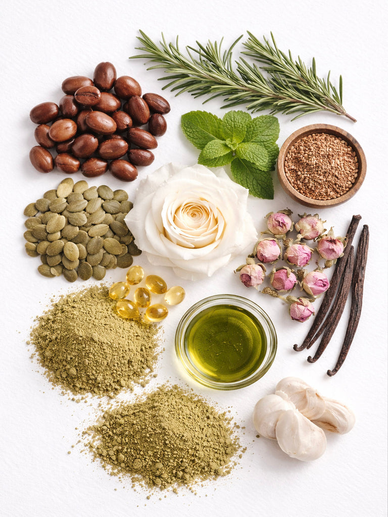 Organic Pumpkin Seed Oil – Often associated in traditional wellness literature with supporting healthy scalp function; it contains compounds that may help inhibit 5-alpha-reductase activity in laboratory studies (5-alpha-reductase is the enzyme that helps convert testosterone into dihydrotestosterone (DHT), a hormone associated with some forms of weakened hair follicles in genetically susceptible individuals).