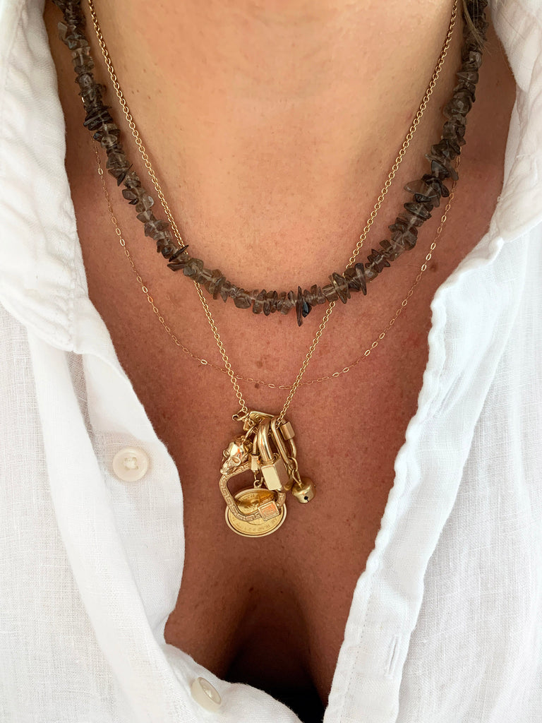 It features genuine Smoky Quartz "chips" and fastens with a 14k gold-filled clasp closure, taking it to the next (luxe) level. Available in classic 18 inch (46cm) length, with proportions that are reminiscent of the Puka Shell necklaces worn by the surfer boys of the 1970s. Every Surfer Boy Necklace comes in an Indian silk drawstring pouch, ready to give (or receive).