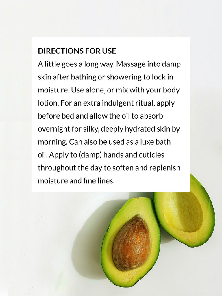 A little goes a long way. Massage into damp or wet skin after bathing or showering to lock in moisture. Use alone, or mix with your body lotion. For an extra indulgent ritual, apply before bed and allow the oil to absorb overnight for silky, deeply hydrated skin by morning. Can also be used as a luxe bath oil. Apply to (damp) hands and cuticles throughout the day to soften and replenish moisture and fine lines. IMPORTANT: Turn the bottle upside down for a few seconds, before applying a few pumps into you hand (the heavier oils have a tendency to sink to the bottom).