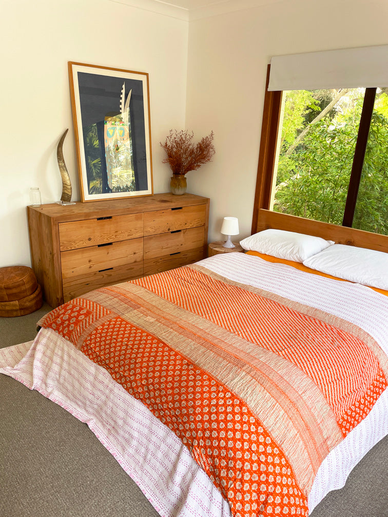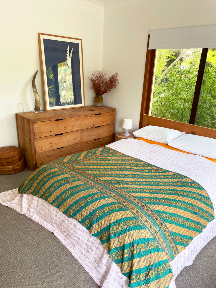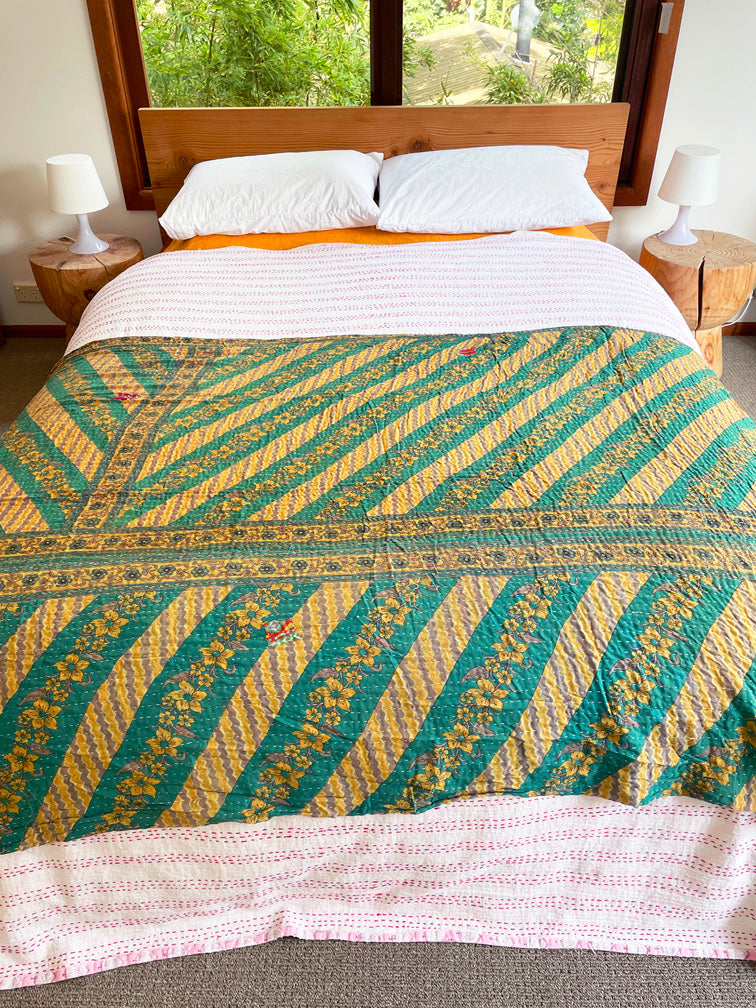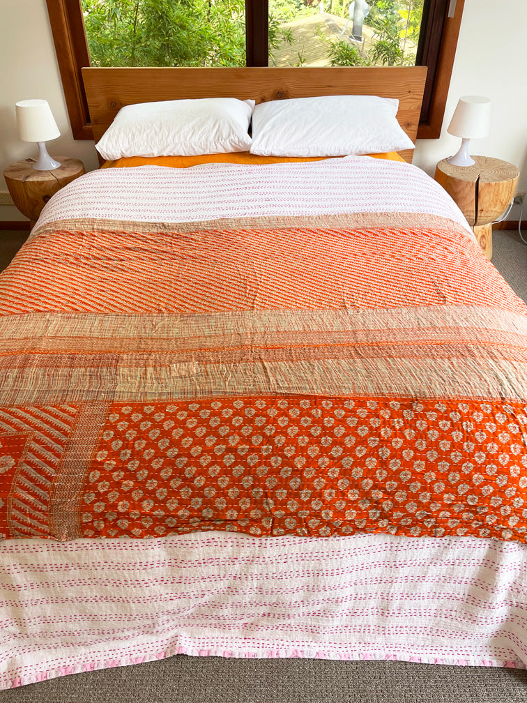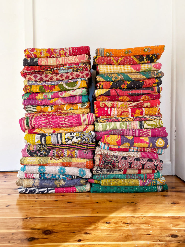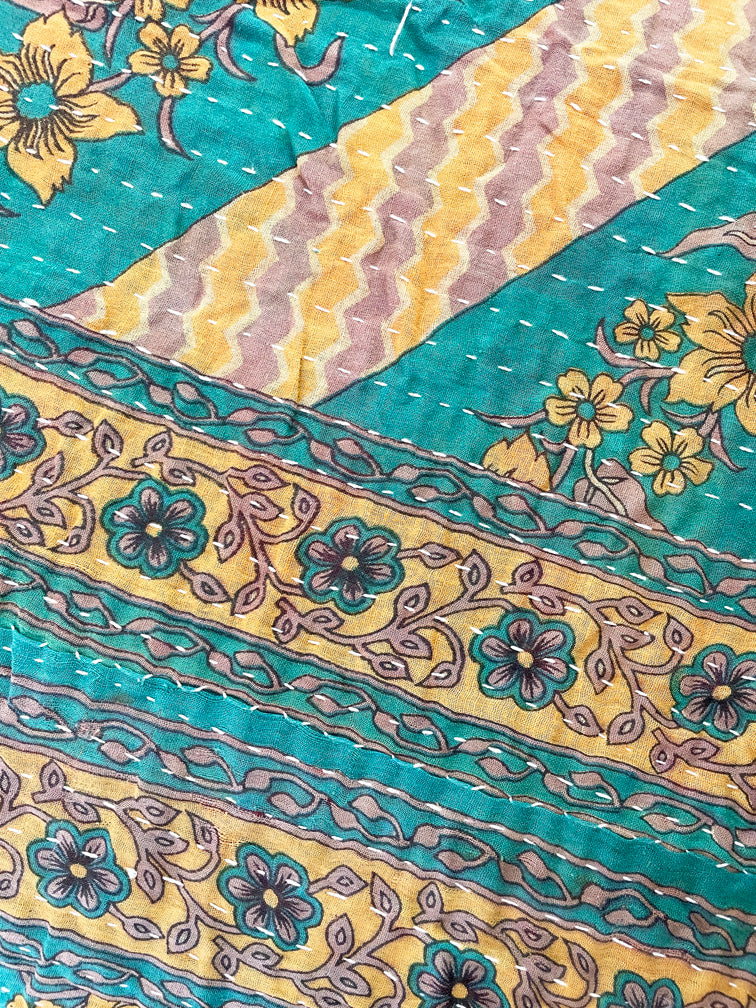 Each piece is 100% original and no two are alike. Made from genuine vintage recycled Indian cotton, hand printed and hand stitched in the traditional Kantha running stitch the length of the throw.
