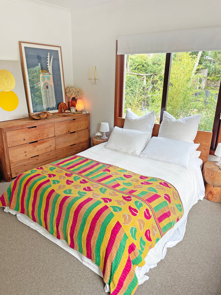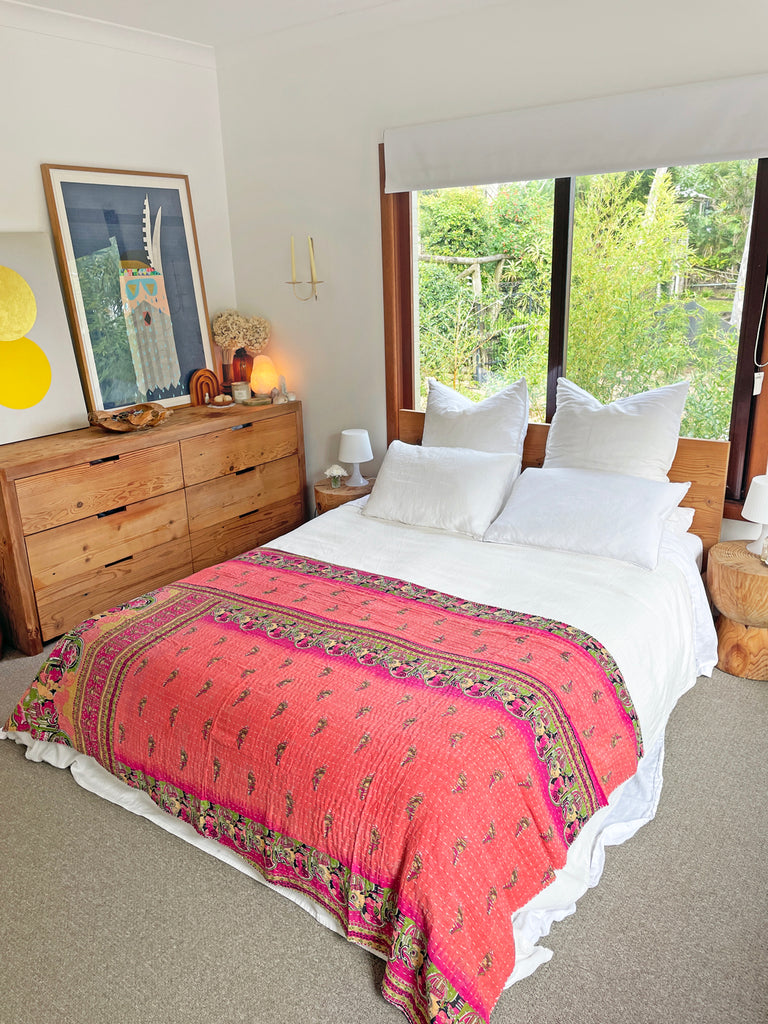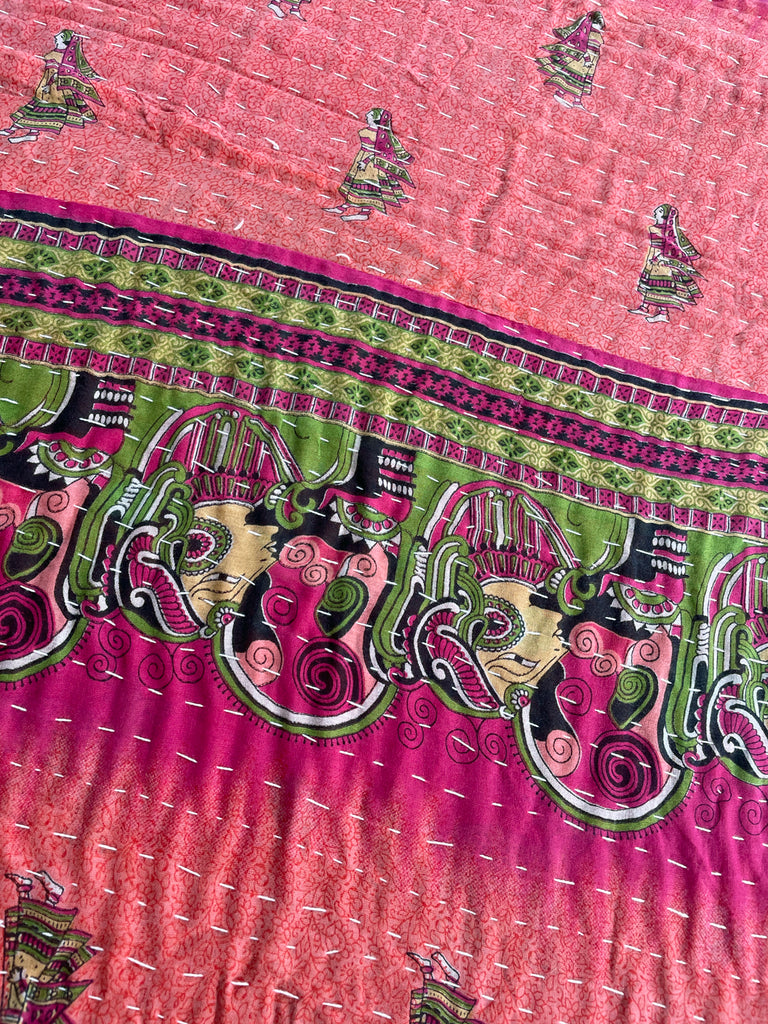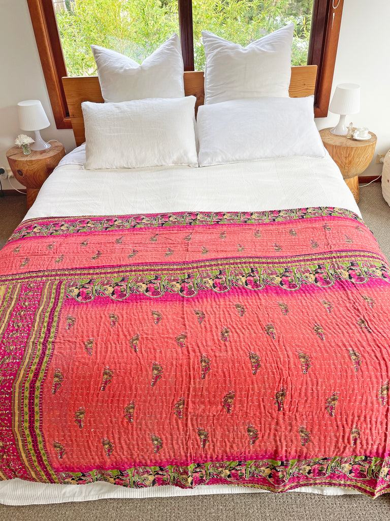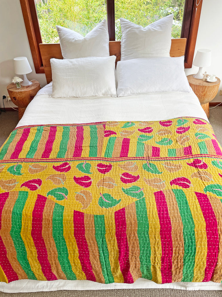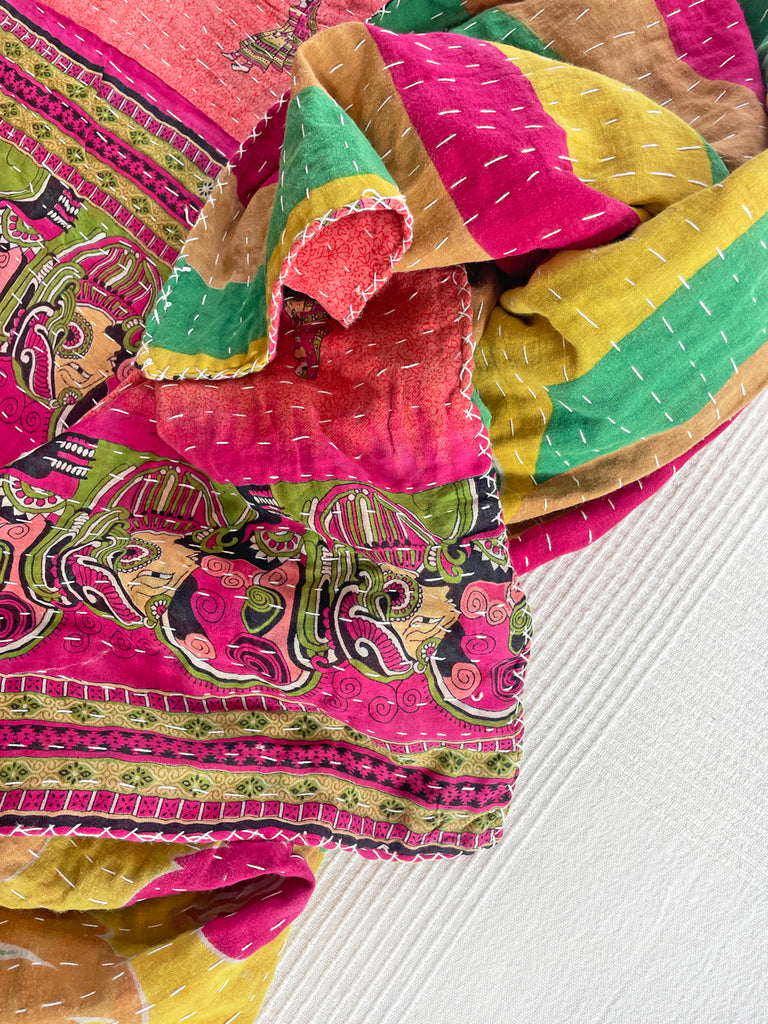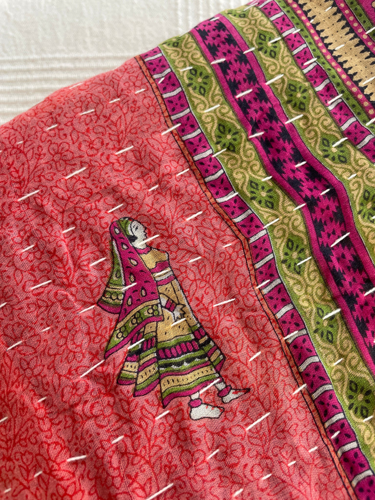 Each piece is 100% original and no two are alike. Made from vintage Indian cotton fabric, hand printed and hand stitched in the traditional Kantha running stitch the length of the throw.